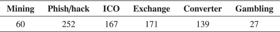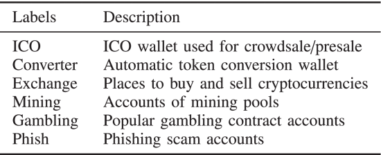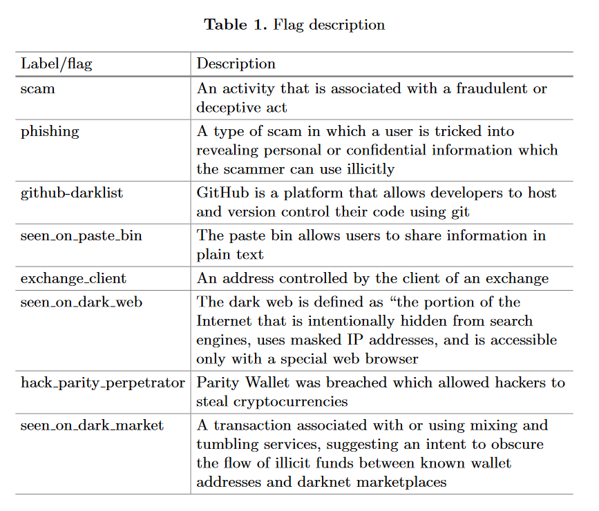 由于来自 BIG 的原始数据包含所有地址的详细标签标志,为了确定 MS,我们需要问什么类型的标签描述非法活动?通过与 BIG 的合作,并基于以前的工作(Sex, drugs, and bitcoin: how much illegal activity is financed through cryptocurrencies?) ,我们专注于许多涉及诈骗、钓鱼攻击和暗网交易的标志。表1提供了这些标签的详细描述。