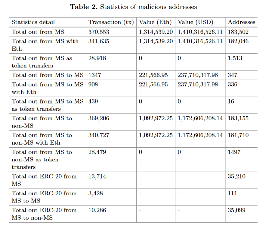 在扩展算法之后产生的恶意集合是23,638个地址,并在2次迭代之后收敛。一个有趣的发现是,尽管恶意集增加了很多,但是传出事务中的 ETH 总量只有轻微增加,达到1,316,153.44 ETH。