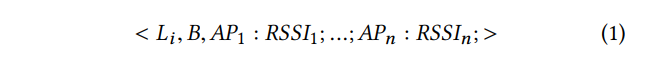 离线指纹识别在每个楼层为每个地标准备一个二维离线指纹图。 用于指纹识别的客户端设备是与网络关联的双频Android手机,它们会主动扫描AP。 对于每个地标,设备都会收集5分钟的数据。 当客户端扫描附近时,AP会为客户端整理RSSI报告,并将其测量结果作为RTLS数据提要发送到位置服务器。 对于给定的地标Li,离线指纹采用以下形式: