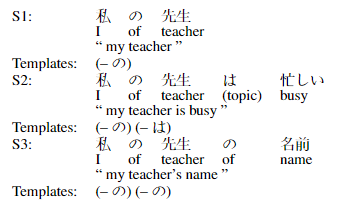 例如,日语句子可以分解为语法模板,专家语言教师和语言学家认为语法单元是最重要的语法知识,并让学生实际学习语言课程。这些模板已被证明对语言学习者的文本难度评估很有帮助[60]。我们发现,语法理解日语句子的特定任务可以分解为(多个)语法模板集。例如,这是三个日语句子及其语法模板