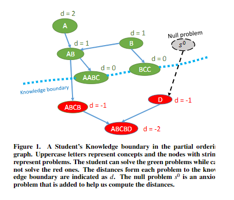 例如,问题AB的距离为1,因为在知识已知边界上的问题AABC比AB直接困难。 与问题B相似(密件抄送比B硬)。 问题A的距离为2,因为从A到知识边界上任何问题的最短定向路径(A→AB→AABC)的长度为2