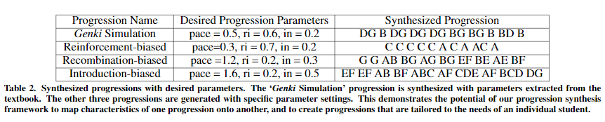 We have discussed two features of an educational progression:composition and pace. In this section, we will demonstratethat educational progressions can be automatically synthesizedaccording to specific composition and pace parameters. To bemore precise, a progression can be characterized as three nu-meric parameters: overall pace (pace), proportion of reinforce-ment (ri), and proportion of introduction (in). The proportionof recombination (rc) is redundant since ri+rc+in=1.