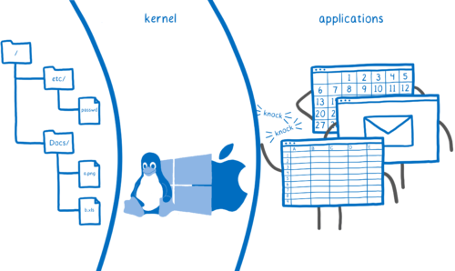 借助保护环的安保,操作系统基本上可以在系统资源周围设置保护屏障。这也就是内核(Kernel)。内核是唯一一个需要做比如创建新文件,打开文件或打开网络连接之类的操作的东西。