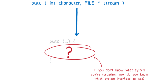 这就是系统接口的所在。例如,为Windows机器编译的printf可以使用Windows API与该机器进行交互。如果要针对Mac或Linux进行编译,它将改用POSIX。