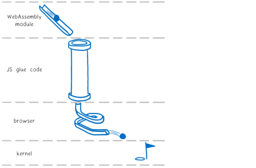 为此,Emscripten创建了自己的libc实现。 此实现分为两部分 —— 将一部分编译到WebAssembly模块中,另一部分用JS胶水代码实现;然后,此JS胶水将调用浏览器,此后浏览器将与OS通信。