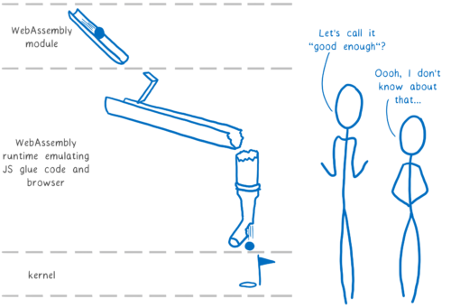 但是现在我们还没有坚实的基础可以构建WASI。浏览器外部的代码需要一种与系统对话的方式,即系统接口,这是当前WASM平台还没有的。