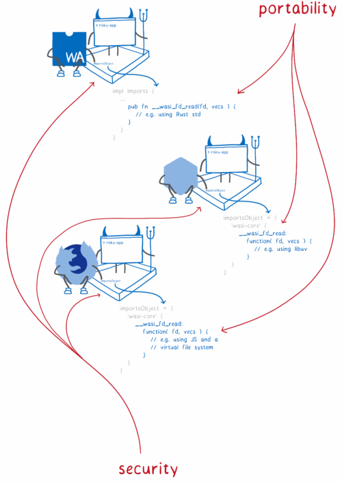 这给我们带来了可移植性,因为每个主机都可以有自己的wasi-core实现,该实现专门针对其平台编写——从Mozilla的wasmtime和Fastly的Lucet之类的WebAssembly运行时,到Node甚至是浏览器。