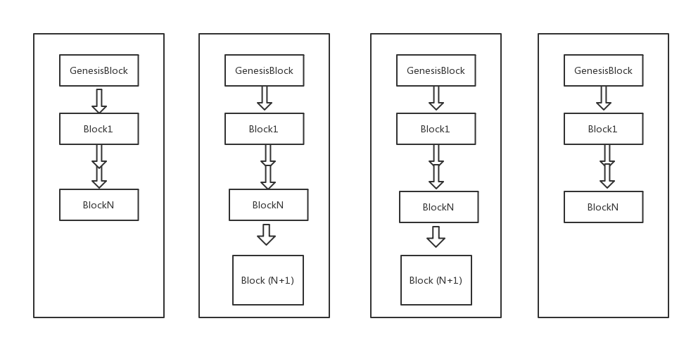 虽然区块链总是存在着在新块生成同时有分叉的风险,但是在旧的区块链中,各节点总是形成相同的一条无任何分叉的链